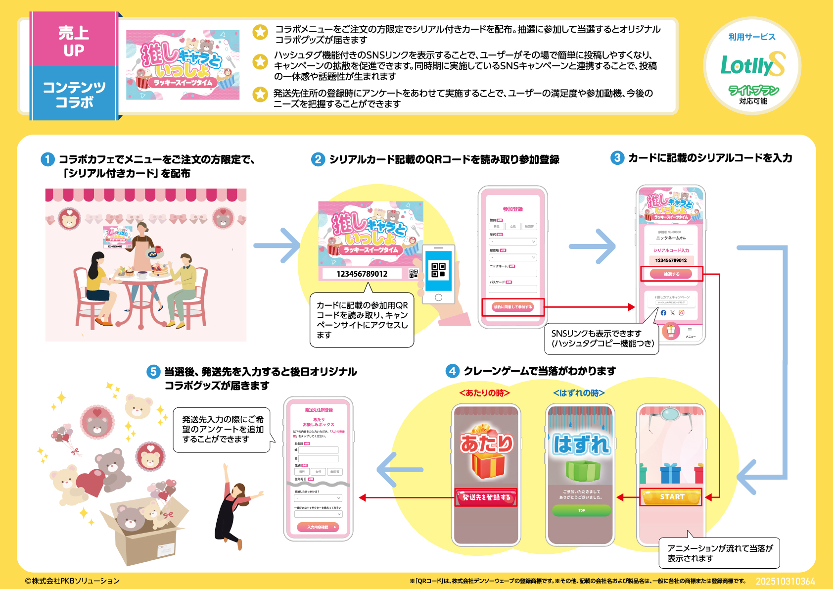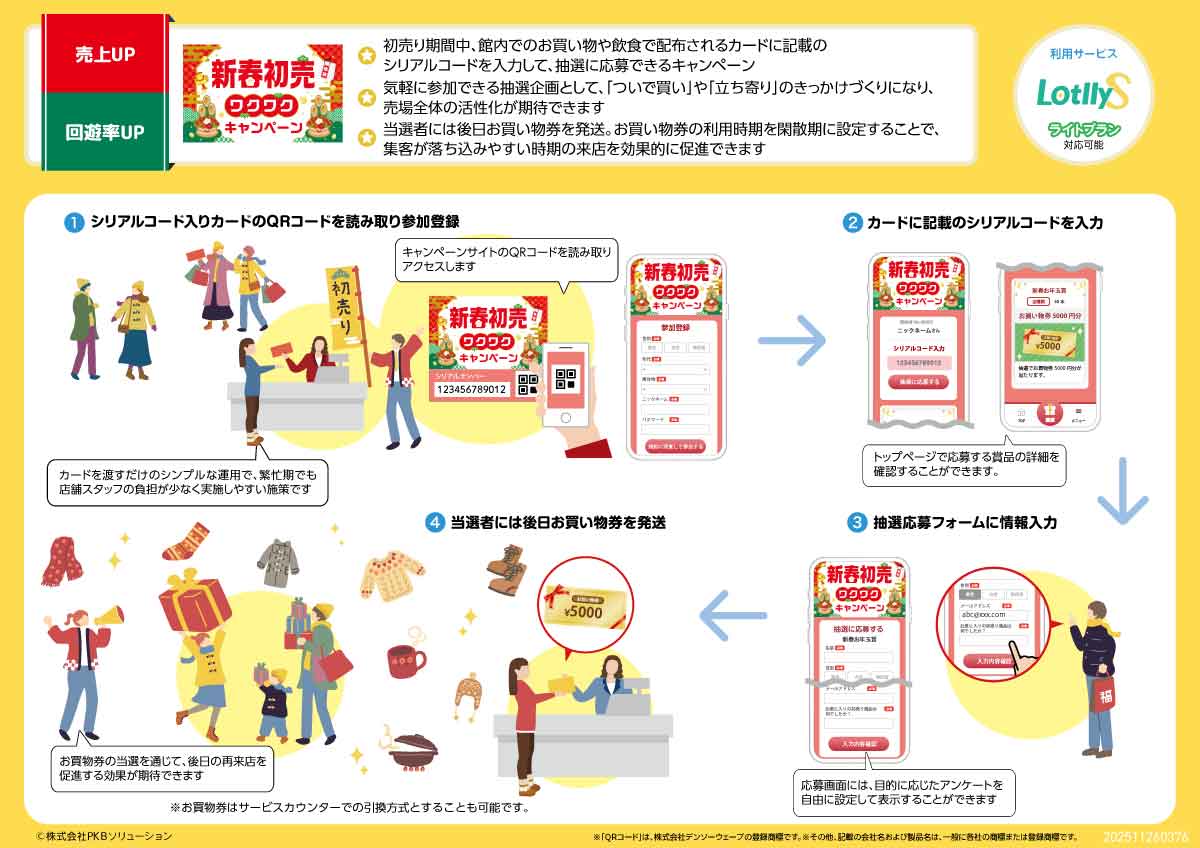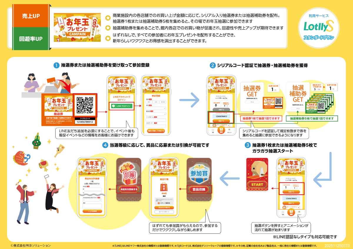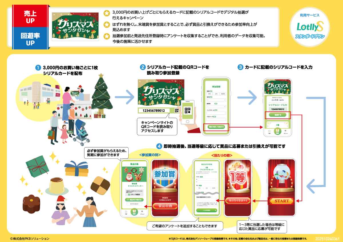 ホーム 企画例 PLAN REQUEST 企画書お取り寄せ まずは企画書のお取り寄せから、お気軽にお申込みください。 通常、48時間以内にご回答させていただきます。(土日祝除く) ※システム開発事業や、自社でシステム構築が可能と当社が判断する場合、見積書や技術資料書面のご提供やご依頼をお断りすることがございますので、予めご了承ください。 お電話でも承ります 03-5577-7888 営業時間:平日 9:00〜18:00 お客様からのご相談に経験豊富なスタッフが個別に対応! 新春初売りワクワクキャンペーン ※画像をクリックすると拡大表示されます。 初売り期間中の商業施設などで開催できるシリアル抽選キャンペーンです。お買い物や飲食をするともらえるカードに記載のシリアルコードを入力すると抽選に参加できます。気軽に参加できる抽選企画として、売上アップ・回遊率向上が期待できます。 企画例一覧ページを見る みんなもらえる!お年玉プレゼントキャンペーン ※画像をクリックすると拡大表示されます。 お正月シーズンの商業施設などで行われるデジタル抽選キャンペーンです。対象店舗でお買い上げごとにもらえる抽選券1枚または抽選補助券5枚で1回参加できます。抽選券を集めることで各店舗を巡ることになるため周遊促進・売上アップにつながります。 企画例一覧ページを見る 推しキャラといっしょキャンペーン ※画像をクリックすると拡大表示されます。 コラボメニューを注文した方限定で、コラボグッズが当たる抽選に参加できるキャンペーンです。ハッシュタグ付きSNSリンクで投稿を促し、キャンペーンの拡散や話題性の向上が期待できます。 企画例一覧ページを見る クリスマスガシャキャンペーン ※画像をクリックすると拡大表示されます。 3,000円購入ごとにもらえるシリアルコードを入力すると、ガシャ抽選に参加できるキャンペーンです。即時抽選後、当選等級に応じた賞品に応募が可能です。また、抽選にはずれた場合は参加賞がもらえます。 企画例一覧ページを見る 空港で楽しめるマイレージ抽選キャンペーン ※画像をクリックすると拡大表示されます。 空港内の店舗でお買物をするともらえるシリアルコードを入力するとポイントがもらえます。ポイントが貯まると、その場で即時抽選を行い、当選すると賞品が当たる抽選に応募可能となります。 企画例一覧ページを見る 夏のスマホ大抽選会 ※画像をクリックすると拡大表示されます。 一定数のポイントを集めると抽選に参加でき、抽選にはずれても参加賞がもらえるため商品の購買意欲向上やキャンペーンへの参加率向上が期待できます。 企画例一覧ページを見る 特別音声が聞ける!THE ARTIST VOICEシリアルキャンペーン ※画像をクリックすると拡大表示されます。 アーティストの音楽・映像作品・グッズを購入するともらえるシリアルコードを入力すると特別音声が再生できるキャンペーンです。購入者限定にすることで、販売促進につながります。 企画例一覧ページを見る 泊まるたび抽選チャンス 宿泊抽選キャンペーン ※画像をクリックすると拡大表示されます。 宿泊するとシリアルコードをもらえて、サイコロゲームに参加できるキャンペーンです。宿泊するほど抽選チャンスがアップするため、複数回利用・再利用を促し売り上げアップにつながります。 企画例一覧ページを見る ルーレット大抽選会 ※画像をクリックすると拡大表示されます。 購入金額に応じて抽選券または抽選補助券がもらえて、一定金額分貯めると抽選ルーレットに参加できるキャンペーンです。抽選補助券は3枚集めないと抽選に参加できないため、商品購買を促進します。 企画例一覧ページを見る 展示会ビューティーシリアル抽選キャンペーン ※画像をクリックすると拡大表示されます。 展示会会場で、ブースに立ち寄るとシリアルコードがもらえて抽選に参加できるキャンペーンです。ブースを多く回るほど、抽選に参加できるので会場内の回遊率向上につながります。 企画例一覧ページを見る ポイントを貯めて応募しよう!コスメ応募キャンペーン ※画像をクリックすると拡大表示されます。 対象商品を購入するとポイントを獲得でき、一定数貯めると抽選に応募できるキャンペーンです。参加者がポイントを貯めるため商品を購入するので、売り上げ増加が見込めます。 企画例一覧ページを見る 来場者限定!シリアル抽選キャンペーン ※画像をクリックすると拡大表示されます。 コンサートに来場した方限定で抽選が行えるキャンペーンです。来場者のみに一人一枚のシリアルコードを配布するため、平等でターゲットを絞った運用が可能です。 企画例一覧ページを見る お買物券が当たる!デジタル抽選キャンペーン ※画像をクリックすると拡大表示されます。 3,000円のお買い上げごとに、デジタル抽選が行えるキャンペーンです。属性アンケートで利用者のデータを取得でき、次回以降の施策にご活用いただけます。 企画例一覧ページを見る 必