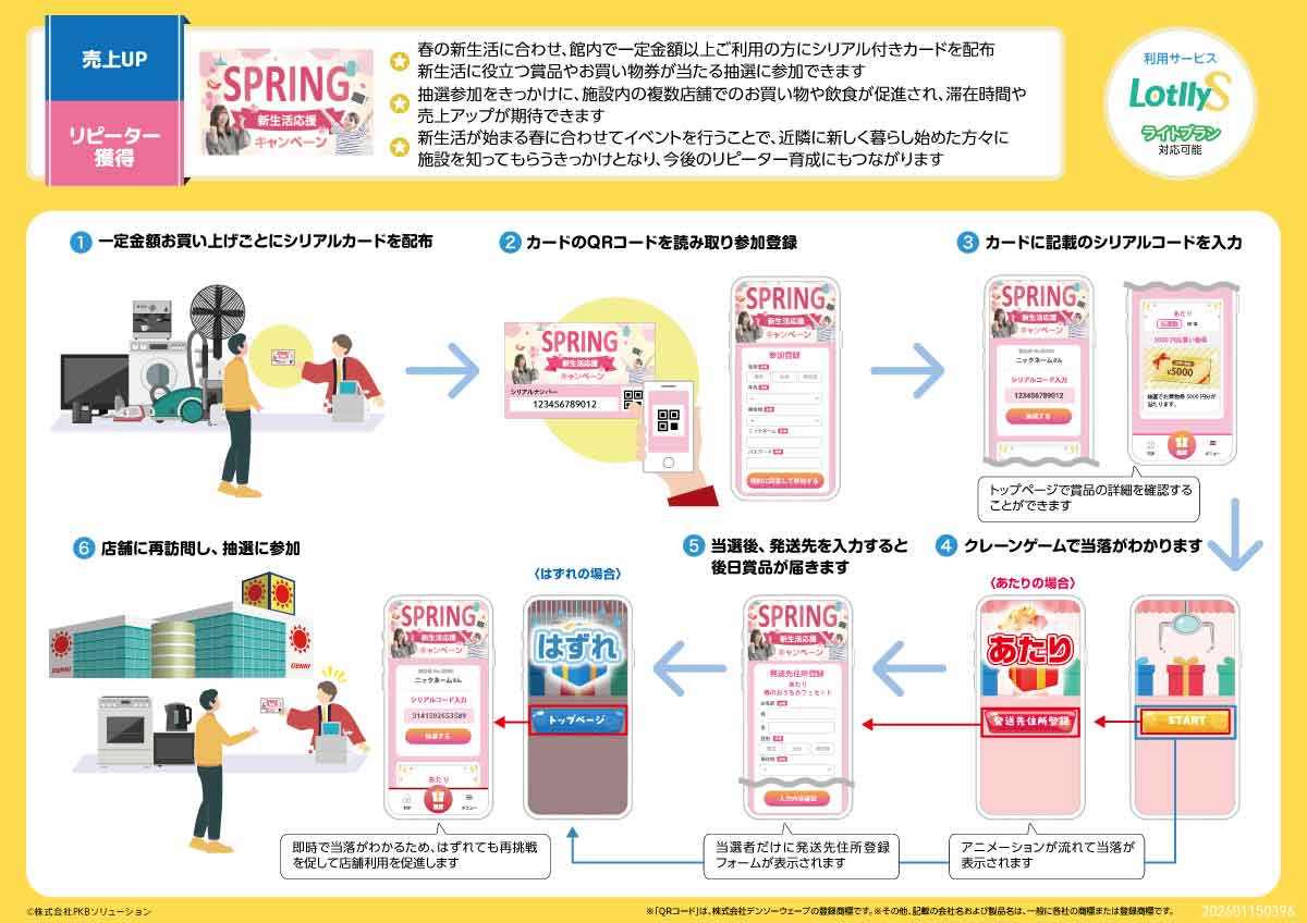 新生活に合わせて、一定金額以上の商品を購入するとシリアルコードを配布し、賞品やお買物券が当たる抽選に参加できるキャンペーンです。新生活シーズンい合わせて実施することで、認知度を上げ、以後のリピーター獲得にもつながります。